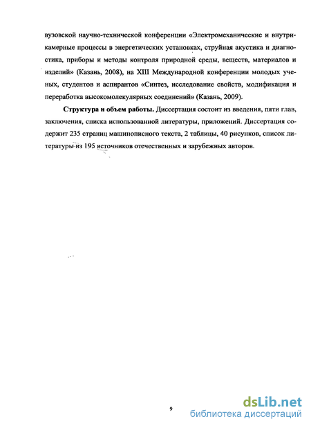Апробация работы. Результаты работы представлены на II семинаре молодых ученых и специалистов «Проблемы тепломассообмена и гидродинамики в энергомашиностроении» (Казань, октябрь 2000), на V Международной научно-практической конференции КГТУ. (Казань, 1999), на Российском национальном симпозиуме по энергетике (Казань, сентябрь 2001), на Молодежной научно-практической конференции (Альметьевск, сентябрь 2002 г.), на Международной научно-технической и методологической конференции «Современные проблемы технической химии» (Казань, 2004), на ХХ Всероссийской межвузовской научно-технической конференции «Электромеханические и внутрикамерные процессы в энергетических установках, струйная акустика и диагностика, приборы и методы контроля природной среды, веществ, материалов и изделий» (Казань, 2008), на XIII Международной конференции молодых ученых, студентов и аспирантов «Синтез, исследование свойств, модификация и переработка высокомолекулярных соединений» (Казань, 2009).