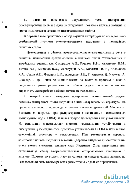 Во второй главе проводится построение математической модели переноса электромагнитного излучения в плоскопараллельных структурах на примере планарного волновода в рамках системы уравнений Максвелла. Важнейшим вопросом при распространении нелинейных поверхностных волноводных мод (НПВМ) является вопрос исследования их устойчивости. На основании существующих методов исследования устойчивости в диссертации рассматривается проблема устойчивости НПВМ в нелинейной трехслойной структуре с поглощением. При рассмотрении переноса электромагнитного излучения в тонких (порядка микрона) диэлектрических слоях может оказывать влияние сила Казимира. Сила притяжения или отталкивания между макроскопическими материальными границами в вакууме. Поэтому во второй главе на основании существующих данных по исследованию силы Казимира была рассмотрена модель ее определения.