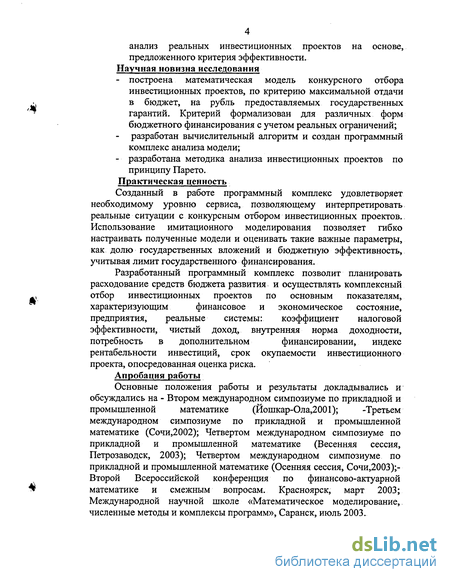 - построена математическая модель конкурсного отбора инвестиционных проектов, по критерию максимальной отдачи в бюджет, на рубль предоставляемых государственных гарантий. Критерий формализован для различных форм бюджетного финансирования с учетом реальных ограничений;