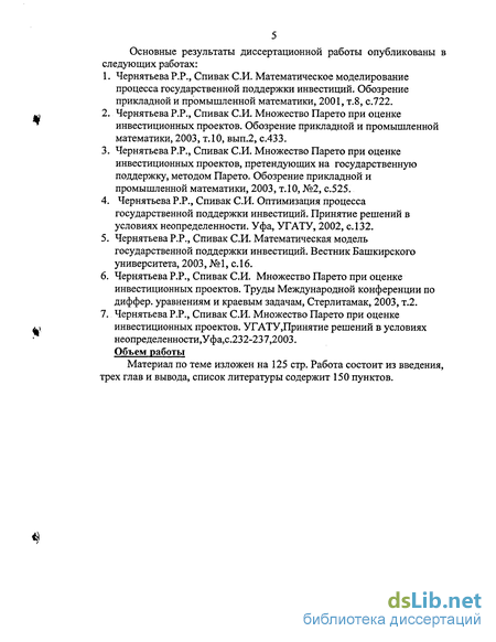 6. Чернятьева P.P., Спивак СИ. Множество Парето при оценке инвестиционных проектов. Труды Международной конференции по диффер. уравнениям и краевым задачам, Стерлитамак, 2003, т.2.