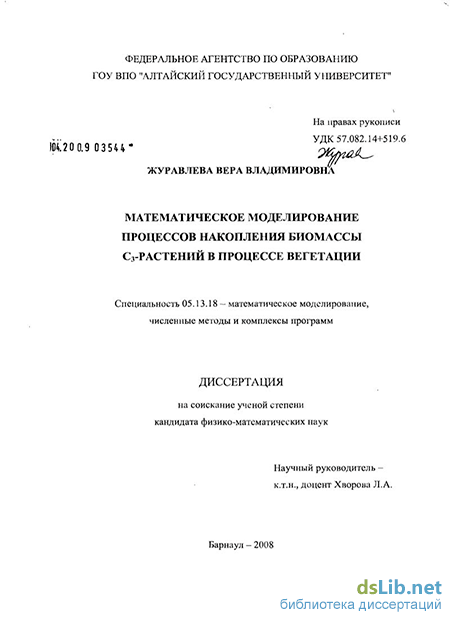 Предметом диссертационного исследования являются математические модели фотосинтеза, дыхания, роста и развития растений, закономерности и характеристики явлений и процессов, протекающих в растении.