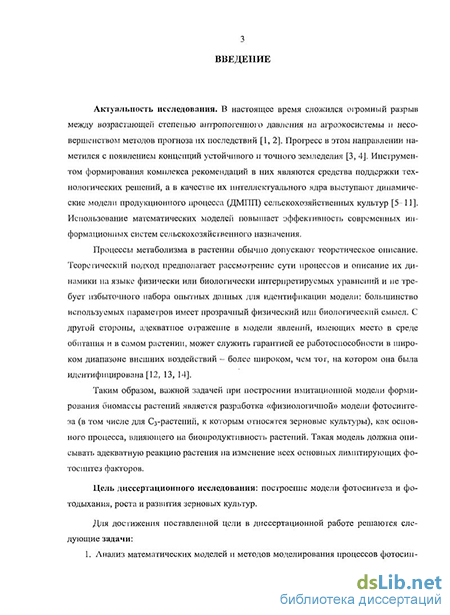 Цель диссертационного исследования: построение модели фотосинтеза и фотодыхания, роста и развития зерновых культур.