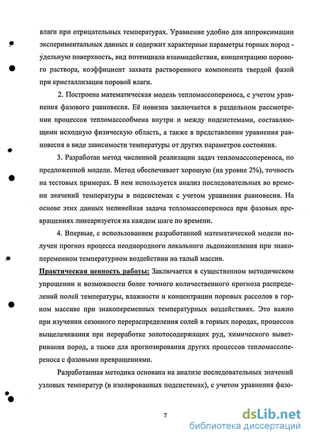 В настоящей главе предлагаемый метод расчета математической модели тепломассообмена апробирован для процессов тепло-влаго-солепереноса в массиве горных пород при фазовых превращениях.