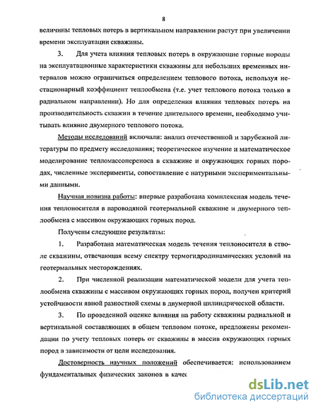 9 разработке математических моделей, современными представлениями о природе и механизмах тепломассопереноса; корректным применением численных методов; согласованием расчетных значений, полученных по разработанной модели с опытными данными и расчетами, проведенными по другим методикам; положительными результатами внедрения разработанных технологий на геотермальных промыслах.