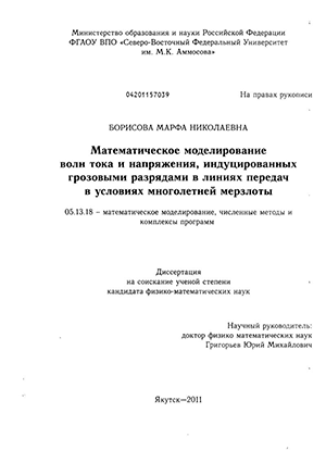 Математические модели волн тока и напряжения в магистральных линиях передач в условиях многолетней мерзлоты в предположении о мгновенном характере разряда облака и с учетом зависимости разряда облака от времени, и их вычислительные реализации.
