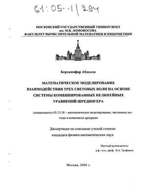 В первом и втором параграфах первой главы рассматривается постановка задачи взаимодействия трех фемтосекундных импульсов в первом и втором приближении теории дисперсии. Такая задача, как известно, в общем случае описывается системой уравнений Максвелла совместно с нелинейным уравнением относительно поляризации среды. При этом распространение фемтосе-кундного импульса в оптическом волокне во втором приближении теории дисперсии описывается системой безразмерных комбинированных нелинейных уравнений Шредингера, характерной особенностью которых является наличие производной по времени от нелинейного отклика среды. С целью устранения в исходных уравнениях производной по времени от нелинейного слагаемого вводятся новые функции по определенному правилу, позволяющие выделить линейный дифференциальный оператор.