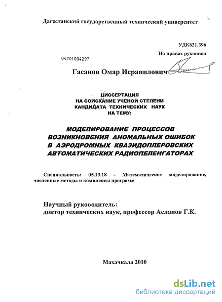 Целью диссертационного исследования является моделирование процессов возникновения аномальных ошибок в квазидоплеровских аэродромных автоматических радиопеленгаторах с целью повышения безопасности управления воздушным движением.