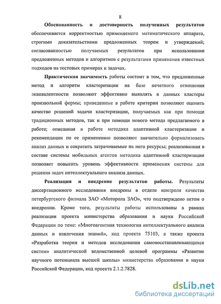 Реализация и внедрение результатов работы. Результаты диссертационного исследования внедрены в отделе контроля качества петербургского филиала ЗАО «Моторола ЗАО», что подтверждено актом о внедрении. Кроме того, результаты работы использованы в рамках реализации проекта министерства образования и науки Российской Федерации по теме: «Многоагентная технология интеллектуального анализа данных и извлечения знаний», код проекта 75103, а также проекта «Разработка теории и методов исследования самовосстанавливающихся систем» аналитической ведомственной целевой программы «Развитие научного потенциала высшей школы» министерства образования и науки Российской Федерации, код проекта 2.1.2.7828.