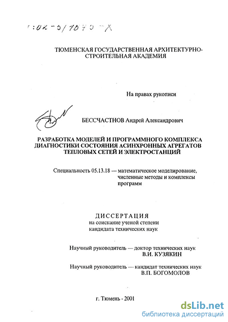 Бессчастнов Андрей Александрович. Разработка моделей и программного комплекса диагностики состояния асинхронных агрегатов тепловых сетей и электростанций : диссертация ... кандидата технических наук : 05.13.18.- Тюмень, 2001.- 149 с.: ил. РГБ ОД, 61 02-5/1675-X