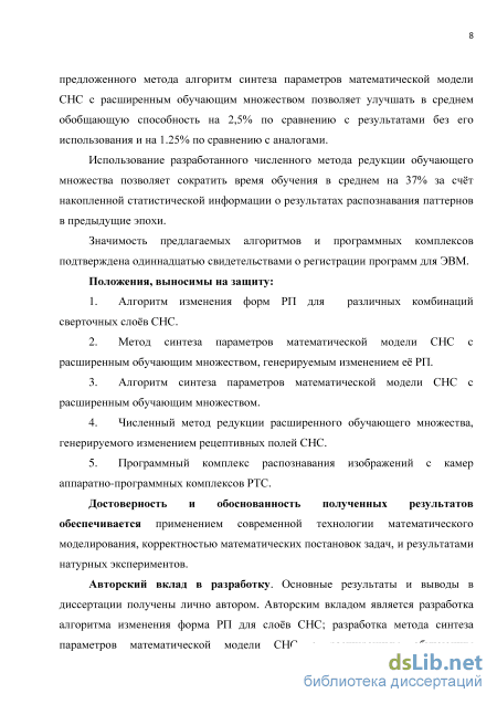 Авторский вклад в разработку. Основные результаты и выводы в диссертации получены лично автором. Авторским вкладом является разработка алгоритма изменения форма РП для слоёв СНС; разработка метода синтеза параметров математической модели СНС с расширенным обучающим множеством, генерируемым изменением её РП; разработка алгоритма синтеза параметров для математической модели СНС с расширенным обучающим множеством; разработка численного метода редукции расширенного обучающего множества; проведение натурных экспериментов с распознаванием реальных объектов, а также экспериментов с распознаванием паттернов из тестовых выборок MNIST, Small NORB и выборки, созданной для стенда «Мехатроника».
