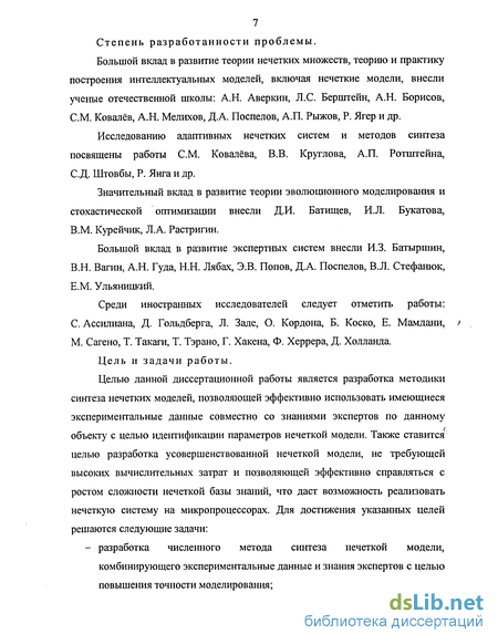 Целью данной диссертационной работы является разработка методики синтеза нечетких моделей, позволяющей эффективно использовать имеющиеся экспериментальные данные совместно со знаниями экспертов по данному объекту с целью идентификации параметров нечеткой модели. Также ставится целью разработка усовершенствованной нечеткой модели, не требующей высоких вычислительных затрат и позволяющей эффективно справляться с ростом сложности нечеткой базы знаний, что даст возможность реализовать нечеткую систему на микропроцессорах. Для достижения указанных целей решаются следующие задачи:
