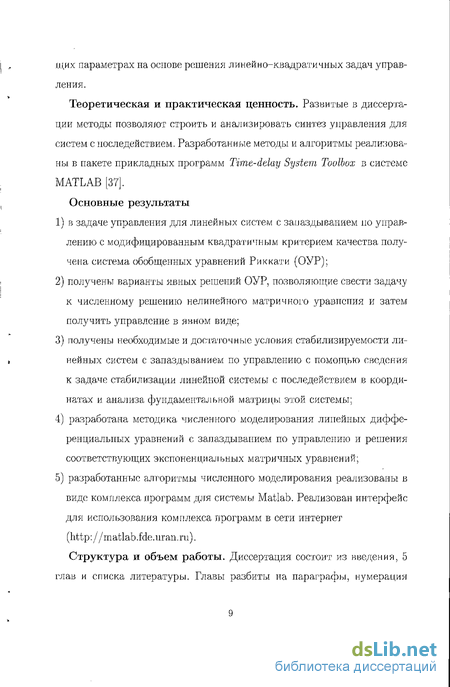 Теоретическая и практическая ценность. Развитые в диссертации методы позволяют строить и анализировать синтез управления для систем с последействием. Разработанные методы и алгоритмы реализованы в пакете прикладных программ Time-dday System Toolbox в системе MATLAB [37].