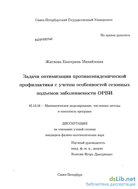 Диссертационная работа опирается на исследования по математической эпидемиологии, представленные в работах Н. Бейли, В. Кермака и А. Мак Кендрика, Д. Кендалла, Р. Росса, О.В. Барояна, Л.А. Рвачева, Ю.Р Иванникова и др. Вакцинация рассматривается как средство управления эпидемическим процессом. Возникающие при этом математические задачи являются дополнением к уже известным задачам математической эпидемиологии. Аналогичные исследования проводились в работах И. Гонзалеза-Гусмана, Л.К. Бабаджанянца, И.Ю. Потоцкой и др., но в отличии от них использованы особенности развития эпидемии.