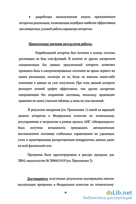 Разработанный алгоритм был положен в основу системы репликации на базе хэш-функций. В отличие от других алгоритмов синхронизации баз данных предлагаемый алгоритм позволяет приводить базы в синхронизированное состояние во время первого же сеанса репликации, несмотря на то, были ли внесены какие-либо изменения в данные на узле получателе. При этом данный алгоритм расходует сетевой трафик эффективнее, чем другие алгоритмы синхронизации без сохранения состояния, поскольку производит сравнение не самих участков таблицы, а лишь их хэш-значений.