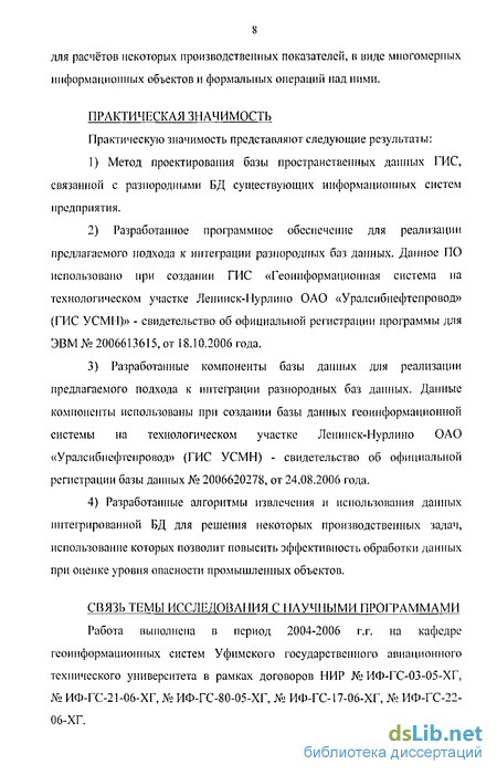 Разработанные компоненты базы данных для реализации предлагаемого подхода к интеграции разнородных баз данных. Данные компоненты использованы при создании базы данных геоинформационной системы на технологическом участке Ленинск-Нурлино ОАО «Уралсибнефтепровод» (ГИС УСМН) - свидетельство об официальной регистрации базы данных № 2006620278, от 24.08.2006 года.