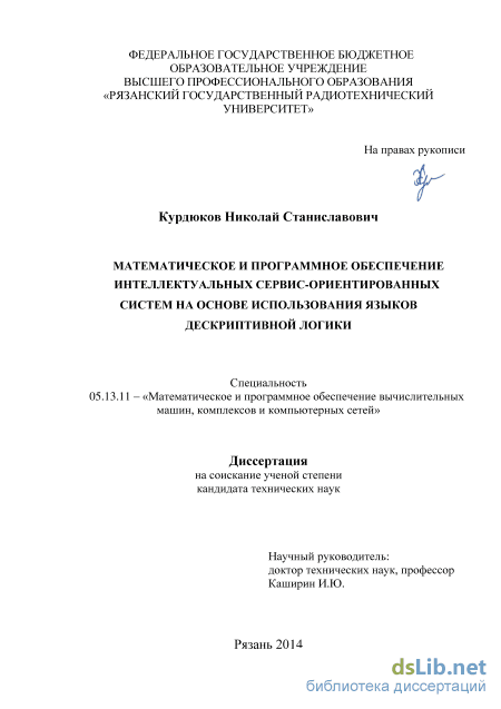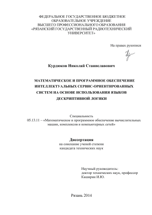 Кудрюков Николай Станиславович. Математическое и программное обеспечение интеллектуальных сервис-ориентированных систем на основе использования языков дескриптивной логики: диссертация ... кандидата технических наук: 05.13.11 / Кудрюков Николай Станиславович;[Место защиты: Рязанский государственный радиотехнический университет].- Рязань, 2014.- 137 с.
