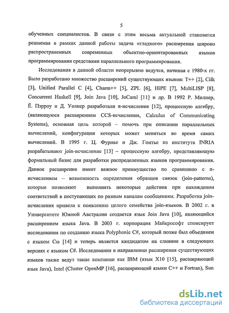 Исследования в данной области непрерывно ведутся, начиная с 1980-х гг. Было разработано множество расширений существующих языков: Т++ [2], Cilk [3], Unified Parallel С [4], Charm++ [5], ZPL [6], HiPE [7], MultiLISP [8], Concurrent Haskell [9], Join Java [10], JoCaml [11] и др. В 1992 P. Милнер, Ё. Пэрроу и Д. Уолкер разработали л-исчисление [12], процессную алгебру, (являющуюся расширением CCS-исчисления, Calculus of Communicating Systems), основная цель которой - помочь при описании параллельных вычислений, конфигурация которых может меняться во время самих вычислений. В 1995 г. Ц. Фурнье и Дж. Гонтье из института INRIA разрабатывают join-исчисление [13] - процессную алгебру, представляющую формальный базис для разработки распределенных языков программирования. Данное расширение имеет важное преимущество по сравнению с я> исчислением — возможность определения образцов связок (join-patterns), которые позволяют выполнять некоторые действия при нахождении соответствий в поступающих по разным каналам сообщениям. Разработка join-исчисления привела к появлению целого семейства join-языков. В 2002 г. в Университете Южной Австралии создается язык Join Java [10], являющийся расширением языка Java. В 2003 г. корпорация Майкрософт спонсирует исследования по созданию языка Polyphonic С#, который позже был объединен с языком Сш [14] и теперь является кандидатом на слияние в следующих версиях с языком С#. Исследования в направлении расширения существующих языков также ведут такие компании как IBM (язык XI0 [15], расширяющий язык Java), Intel (Cluster OpenMP [16], расширяющий языки C++ и Fortran), Sun