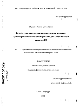 Публикации. Основные результаты диссертации опубликованы в работах [1-5]. В работах [1, 4, 5] Сафонову В.О. принадлежат общие постановки задач, а Муханову Р.С. - разработка и реализация методов и принципов решения данных задач, разработка примеров и программного комплекса. В работе [3] соискателю принадлежит описание основных принципов при разработке первой версии инструментария аспектно-ориентированного программирования для академической версии .NET. В публикации [5] соискателю принадлежит описание особенностей реализации и методов применения библиотеки QT при разработке инструментария. В статье [2] соискателем описывается разработанный комплекс методов реализации инструментария аспектно-ориентированного программирования с учетом специфики целевой платформы -академической версии .NET (SSCLI/Rotor). В публикации [4] соискатель