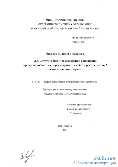 Миронов Дмитрий Витальевич. Асимптотическое представление отношения правдоподобия для нерегулярных семейств распределений в многомерном случае : диссертация ... кандидата физико-математических наук : 01.01.05.- Новосибирск, 2001.- 53 с.: ил. РГБ ОД, 61 01-1/911-6