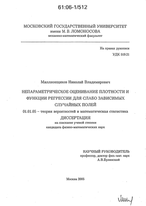 Основные результаты диссертации опубликованы в работах автора [10], [20], [62], [21]. В работе [10] А.В.Булинскому принадлежит постановка задачи и разработка подхода, основанного на использовании ковариационных неравенств, Н.В.Миллионщикову принадлежит асимптотический анализ вспомогательных функций и оптимизация используемых параметров. Все остальные результаты получены Н.В.Миллионщиковым самостоятельно. Результаты диссертации докладывались на международной конференции "Колмогоров и современная математика" (Москва, 2003), в 2005 году на Большом семинаре кафедры теории вероятностей механико-математического факультета МГУ (руков. чл.-корр. РАН, проф. А.Н.Ширяев), а также в 2004 и 2005 годах на семинаре "Асимптотический анализ случайных процессов и полей" (мех-мат МГУ, руков. проф. А.В.Булинский и проф. В.И.Питербарг). Автор благодарен своему научному руководителю профессору А.В.Булинскому за постановку задач, постоянное внимание к работе и ценные советы.