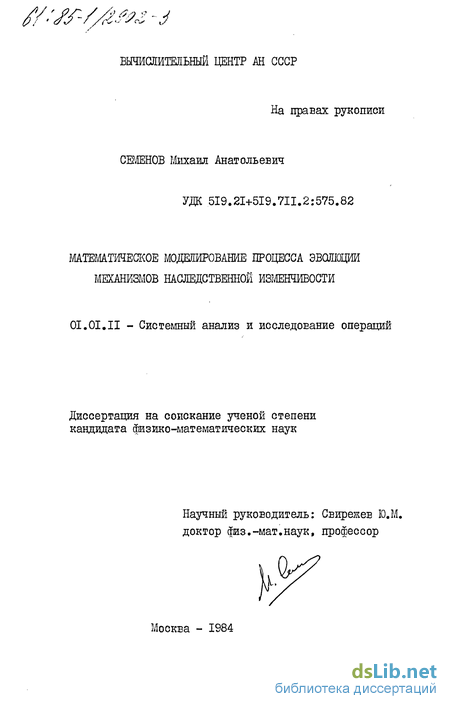 Поскольку функция т имеет конечную дисперсию D-f EQ -E-f-), то по центральной предельной теореме Гі2"] для достаточно больших Среднеквадратичная погрешность одг = — оценки і к убывает как і /J д[ .В последующих вычислениях доверительный интервал выбирался равным 3d# , что обеспечивает правильность вычисления 1 с вероятностью 0,997, т.е, Оценка дисперсии _до производилась одновременно с вычислением оценки математического ожидания Ідо по формуле Для вычисления суб- и супермартингальных характеристик процессов (Ч{ ) и (УО необ дда0 вычислять интегралы, завися- щие от параметра Используя схему метода Монте-Карло, можно вычислить значе ния интеграла I ( Л") в конечном числе точек к. Поскольку для каждого Я І использовалась независимая выбор ка Х а... &м f то можно оценить вероятность правильности вы числений интеграла во всех точках {\1ц ОЛ -1СЦ лО У "U 099? Таблицы с вычислениями суб- и супермартингальных характеристик для процессов (Л/J ) и \у ) приведены в приложении 5. В работе, в рамках стохастической модели, изучены основные закономерности процесса эволюции механизмов изменчивости. Для исследования сходимости и скорости сходимости эволюционных процессов предложен новый подход, основанный на использовании стохастической функции Ляпунова. К основным новым результатам, полученным в работе, относятся следующие [22-26]