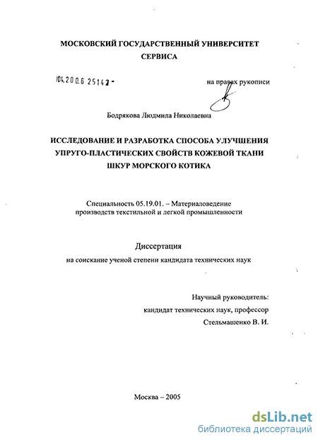 Бодрякова Людмила Николаевна. Исследование и разработка способа улучшения упруго-пластических свойств кожевой ткани шкур морского котика : Дис. ... канд. техн. наук : 05.19.01 Москва, 2005 182 с. РГБ ОД, 61:06-5/1312