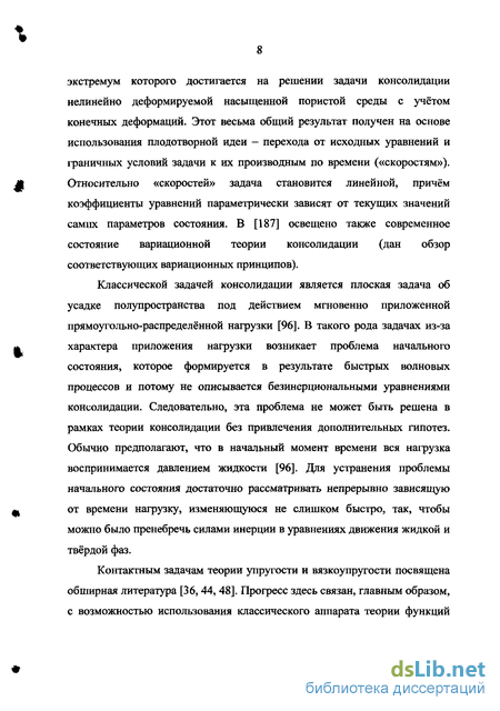 Вариационный подход применялся также к исследованию фильтрации в деформируемой пористой среде: изучался процесс консолидации (уплотнение насыщенной пористой средой под действием внешней нагрузки). Вариационная формулировка (принцип) служит при этом основой для построения приближённого решения задачи, например, методом конечных элементов. В работе [187] построен функционал, экстремум которого достигается на решении задачи консолидации елинейно деформируемой насыщенной пористой среды с учётом конечных деформаций. Этот весьма общий результат получен на основе использования плодотворной идеи - перехода от исходных уравнений и граничных условий задачи к их производным по времени («скоростям»). Относительно «скоростей» задача становится линейной, причём коэффициенты уравнений параметрически зависят от текущих значений самих параметров состояния. В [187] освещено также современное состояние вариационной теории консолидации (дан обзор соответствующих вариационных принципов).