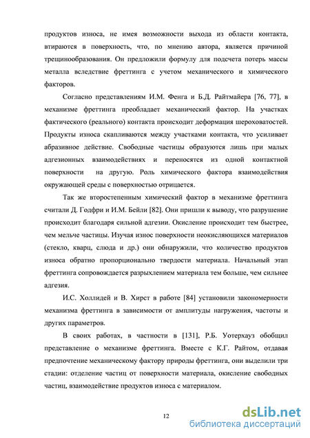 Однако некоторые продукты износа имеют размер намного больше атомарных. К.Г. Райт в работе [37] связывал начальный этап фреттинга с адгезией и образованием «мостиков схватывания». При относительном смещении мостики разрушаются с образованием твердых частиц. Окислы продуктов износа, не имея возможности выхода из области контакта, втираются в поверхность, что, по мнению автора, является причиной трещинообразования. Он предложили формулу для подсчета потерь массы металла вследствие фреттинга с учетом механического и химического факторов.