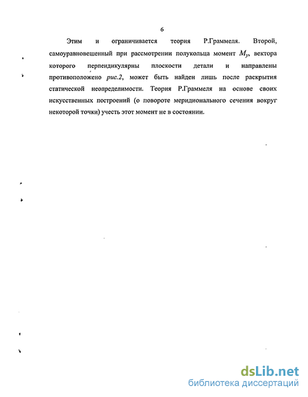 Этим и ограничивается теория Р.Граммеля. Второй, самоуравновешенный при рассмотрении полукольца момент Му, вектора которого перпендикулярны плоскости детали и направлены противоположено рис.2, может быть найден лишь после раскрытия статической неопределимости. Теория Р.Граммеля на основе своих искусственных построений (о повороте меридионального сечения вокруг некоторой точки) учесть этот момент не в состоянии.