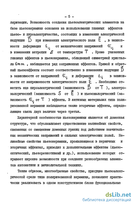В зависимости от своего функционального назначения элементы пьезоэлектронной техники можно разделить на устройства преобразования энергии и устройства обработки информации, предназначенные для её регистрации, хранения и использования. При разработке таких элементов обычно применяются высокоэффективные пьезоак-тивные материалы и, в частности, поляризованная керамика, которая приобретает пьезоэлектрические свойства в результате ее поляризации. Возможность создания пьезоэлектрических элементов на базе пьезокерамики основана на использовании главных эффектов пьезо- и пироэлектричества, состоящих в изменении электрической индукции D при изменении электрического поля Е , в зависимости деформации L. от механических напряжений 6 . и в изменении энтропии U от температуры Т . Кроме указанных главных эффектов в пьезокерамике, обладающей симметрией кристалла біт m , наблюдается ряд сопряженных эффектов. Прямой и обрат-ный пьезоэффекты состоят соответственно в изменении индукции D в зависимости от напряжений 6Т.. и деформации іі\ в зависи-мости от напряженности электрического поля Е . Необходимо отметить еще пироэлектрический (зависимость ) отТ ), электро-калорический (зависимость S от Е ) и пьезокалорический (зависимость Є- от Т ) эффекты. В активных материалах типа поляризованной керамики наблюдаются также вторичные эффекты, определяющие связь двух величин через третьи.