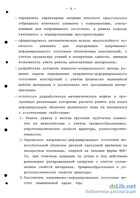 Для этой цели необходимо: проанализировать систему инвариантов напряжений, позволяющую получить уравнения состояния изотропных ди-латирующих материалов, деформирование которых зависит от вида напряженного состояния; на основе полученных в работах Матченко Н.М., Толо-конникова Л.А. и Трещева А.А. форм потенциала деформаций сформулировать уравнения состояния разносопротив-ляющихся дилатирующих материалов, проанализировать форму основных законов деформирования; из простейших экспериментов определить константы уравнений состояния для ряда конструкционных материалов; определить характерные матрицы плоского треугольного гибридного конечного элемента с компонентами, учитывающими вид напряженного состояния, в рамках подхода связанного с нормированными пространствами; сформулировать математическую модель многослойного конечного элемента для определения напряженно-деформированного состояния оболочечных конструкций, с учетом продольных усилий и поперечных сдвигов, имеющую возможность учета работы анизотропных материалов; разработать алгоритм пошагово-итерационного метода решения задачи определения напряженно-деформированного состояния конструкций с учетом физически нелинейной работы материала и реализовать его программную интерпретацию; используя разработанную математическую модель и программную реализацию алгоритма расчета решить ряд задач деформирования оболочек различного вида из материалов с усложненными свойствами: