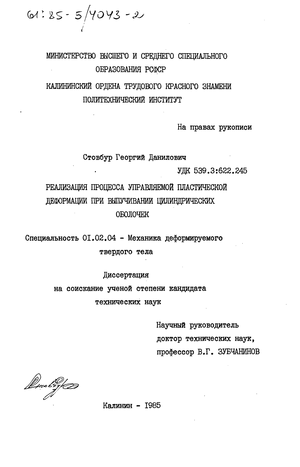 Для современных конструкций характерно увеличение интенсивности воздействий, усложнение условий их эксплуатации, что приводит к необходимости использования неупругой стадии работы материала, учета пластических деформаций и соответствующих внешних факторов при разработке практических методов расчета. Одними из наиболее распространенных конструктивных элементов являются цилиндрические оболочки, для которых в определенных условиях возможна потеря устойчивости. При эксплуатации таких конструкций неустойчивость, как правило, определяет исчерпание ресурса их функционирования и является недопустимой. Однако, в ряде случаев, это явление и последующее закритическое деформирование могут быть использованы в качестве технологического процесса с заданными требованиями, для обеспечения которых необходим как контроль текущих параметров, так и выбор соответствующих геометрических размеров, материала оболочки, условий нагружения и т.д. Реализация такого управляемого процесса деформирования связана с изучением закономерностей процесса упругопластического выпучивания определением критических состояний оболочек (в том числе переменной толщины), зависимости от истории нагружения, давления, температуры, внешних связей и других факторов. В теоретическом плане эти вопросы очень сложны и разработаны недостаточно; цринципиальные трудности возникают уже на этапе постановки задачи при выборе варианта теории пластичности» учете эффектов сложного нагружения, ползучести материала и т.д. Имеющиеся опы-- тные данные весьма немногочисленны, относятся к ограниченным диапазонам исходных параметров и получены по различным методикам, так что их использование практически невозможно. В то же время экспериментальным путем возможно эффективное решение вопросов, связанных как с изучением общих закономерностей, так и с отработкой конкретных конструкций. Таким образом, исследования закономерностей потери устойчивости и неупругого деформирования цилиндрических оболочек, разработка и реализация на этой основе процесса управляемой пластической деформации являются актуальными в механике деформируемого твердого тела и ее приложениях.