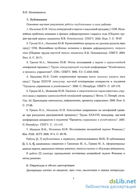 Основные научные результаты работы опубликованы в семи работах: 1. Малькова Ю.В. Метод возмущений в задаче о наклонной трещине// СПб. Нелинейные проблемы механики и физики деформируемого твердого тела (Сборник трудов научной школы академика В.В. Новожилова). СПбГУ. 2003. Вып. 7. С. 79-87 2. Греков М.А., Малькова Ю.В. Криволинейная трещина на границе раздела двух сред// СПб. Нелинейные проблемы механики и физики деформируемого твердого тела (Сборник трудов научной школы академика В.В. Новожилова). СПбГУ. 2004. Вып. 8. С. 56-71. 3. Греков М.А., Малькова Ю.В. Метод возмущений в задаче о криволинейной межфазной трещине// Труды международной научной конференции "Устойчивость и процессы управления". СПб.: СПбГУ. 2005. Т.З. С.1655-1656. 4. Малькова Ю.В. Слабо искривленная трещина около границы раздела двух сред// Труды XXXVII междунар. научной конференции аспирантов и студентов "Процессы управления и устойчивость". 2006. С.-Петербург. СПбГУ. С. 167-172. 5. Греков М.А., Малькова Ю.В. Силовые и энергетические характеристики упругого поля у вершины криволинейной межфазной трещины// Вестн. С.-Петерб. ун-та. Сер. 10: Прикладная математика, информатика, процессы управления. 2006. Вып. 3. С. 17-28. 6. Греков М.А., Малькова Ю.В, Контактные напряжения на межфазной границе при раскрытии приграничной трещины// Труды XXXVIII междунар. научной конференции аспирантов и студентов "Процессы управления и устойчивость". 2007. С.-Петербург. СПбГУ. С. 141-146. 7. Мальков В.М., Малькова Ю.В. Исследование нелинейной задачи Фламана// Изв. РАН. МТТ. 2006. Л 5. С. 68-78. Работы [5, 7] опубликованы в журналах, рекомендованных ВАК. В публикациях [2, 3. 5, 6], написанных совместно с Грековым М, А., Греков М. А. сформулировал данные задачи, предложил методы решения, консультировал и обсуждал результаты. В работе [7] соавтору принадлежит постановка нелинейной задачи Фламана и метод решения. Диссертация состоит из введения, трех глав, заключения и списка литературы. Общий объем диссертации 124 стр., общее количество рисунков и графиков - 46, библиография занимает 15 стр. и содержит 226 наименований.
