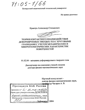 Исследования выполнены в соответствии со следующими темами: "Разработать метод расчета контактных напряжений при упругом контактном взаимодействии цилиндрических тел, не описываемом теорией Герца" (Министерство образования РБ, 1997 г., № ГР 19981103); "Влияние микронеровностей соприкасающихся поверхностей на распределение контактных напряжений при взаимодействии цилиндрических тел, имеющих близкие по величине радиусы" (Белорусский республиканский фонд фундаментальных исследований, 1996 г., № ГР 19981496); "Разработать метод прогнозирования износа опор скольжения с учетом топографических и реологических характеристик поверхностей взаимодействующих деталей, а также наличия антифрикционных покрытий" (Министерство образования РБ, 1998 г., № ГР 1999929); "Моделирование контактного взаимодействия деталей машин с учетом случайности реологических и геометрических свойств поверхностного слоя" (Министерство образования РБ, 1999 г. №ГР2000Г251)