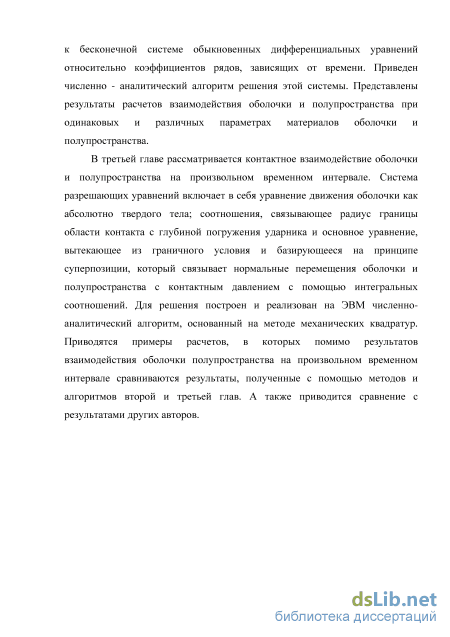 Подобная задача рассмотрена С.Н. Поповым и В.Р. Богдановым для цилиндрической [17] и аналогичная для сферической оболочки [18]. В работах В.Д. Кубенко и В.Р. Богданова исследуется напряженно-деформированное состояние цилиндрической [19], сферической оболочки [20] и упругого полупространства в результате их соударения. Исходные уравнения динамики системы оболочка-полупространство сводятся к бесконечной системе интегральных уравнений Вольтерра второго рода. Здесь предлагаемая методика позволяет рассчитать контактное давление только в лобовой точке. В работах Д.В. Тарлаковского [21 – 23] дополнительно рассмотрено влияние акустического заполнителя в круговой цилиндрической оболочке. Е.Ю. Михайловой, Г.В. Федотенковым, Д.В. Тарлаковским, В.Д. Кубенко и Э.И Старовойтовым рассмотрен удар сферической оболочки типа Тимошенко по упругому полупространству [24 – 30], [31 – 42]. В первых