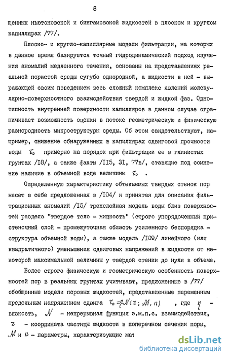 Плоско- и кругло-капиллярные модели фильтрации, на которых в данное время базируется точный гидродинамический подход изучения аномалий медленного течения, основаны на представлениях реальной пористой среды сугубо однородной, а жидкости в ней - выражающей своим поведением весь сложный комплекс явлений молеку-лярно-поверхностного взаимодействия твердой и жидкой фаз. Однотипность внутренней поверхности капилляров в данном случае ограничивает возможность оценки в потоке геометрическую и физическую разнородность микроструктуры среды. Об этом свидетельствуют, например, снижение обнаруженных в капиллярах сдвиговой прочности воды Т0 примерно на порядок при фильтрации ее в глинистых грунтах /18/, а также факты /115, 31, 77в/, ставящие под сомнение наличие в объемной воде величины to .