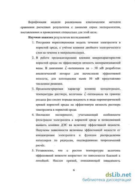 Практическая значимость работы заключается в том, что на её основе будут внесены необходимые коррективы в гидродинамические модели разработки, что позволит избежать погрешностей расчётов, связанных с игнорированием факта существенного отличия вязкости флюида при течении в пористой среде по сравнению с вязкостью этой жидкости в капельном состоянии. Защищаемые положения: 1. Построена перколяционная модель процесса течения минерализованной воды в пористой среде учитывающая влияние ДЭС на границе раздела скелет среды - флюид. 2. Показано, что вязкость слабоминерализованной воды (С 200-400 мг/л экв. NaCl) в тонкопористых песчаниках (0.5 мкм г 4 мкм) возрастает в 1.5-2 раза по сравнению с вязкостью капельной жидкости с такой же степенью минерализации. При высоких концентрациях солей (С 1500 мг/л экв. NaCl) эффективная вязкость равна вязкости капельной жидкости. 3. Установлено, что рост температуры раствора оказывает существенное влияние на изменение величины эффективной вязкости. Характер изменения определяется зависимостью дзета-потенциала от температуры для рассматриваемой системы «твердое тело-электролит». В частности, для песчаников было установлено повышение эффективной вязкости с ростом температуры. Количественные зависимости ц(Т) для различных параметров процесса представлены в графическом виде как результат численных расчётов по представленной модели. 4. Продемонстрировано, что величина эффективной вязкости зависит от вида порометрической кривой и С-потенциала: чем больше капилляров с радиусами, сравнимыми с толщиной ДЭС, тем значительнее эффект электровязкости, с ростом значений С-потенциала эффективная вязкость возрастает для пористых сред со средним радиусом капилляра порядка толщины ДЭС. Если доля сверхтонких капилляров (с радиусами меньше толщины ДЭС) мала, эффект электровязкости становится незначителен. 5. Спланирован и проведён эксперимент, в ходе которого верифицирована предложенная модель течения электролита в пористой среде. 6. Данные эксперимента подтвердили, что заложенные в модель параметры пористой среды и флюида верны.