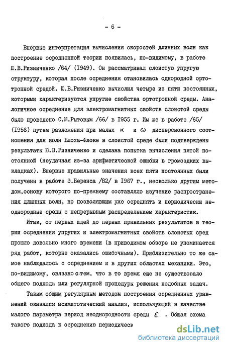 Впервые интерпретация вычисления скоростей длинных волн как построение осредненной теории появилась, по-видимому, в работе Ю.В.Ризниченко /64/ (1949). Он рассматривал слоистую упругую структуру, которая после осреднения становилась однородной орто-тропной средой. Ю.В.Ризниченко вычислил четыре из пяти постоянных, которыми характеризуются упругие свойства ортотропной среды. Аналогичное осреднение для электромагнитных свойств слоистой среды было проведено С.М.Рытовым /66/ в 1955 г. Им же в работе /65/ (1956) путем разложения при малых к. и со дисперсионного соотношения для волн Блоха-Флоке в слоистой среде были подтверждены результаты Ю.В.Ризниченко и сделана попытка вычисления пятой постоянной (неудачная из-за арифметической ошибки в громоздких выкладках). Впервые правильные значения всех пяти постоянных были получены в работе Э.Беренса /82/ в 1967 г., несколько другим методом, основу которого по-прежнему составляло изучение распространения длинных волн, но позволявшим уже осреднять и периодически неоднородные среды с непрерывным распределением характеристик.