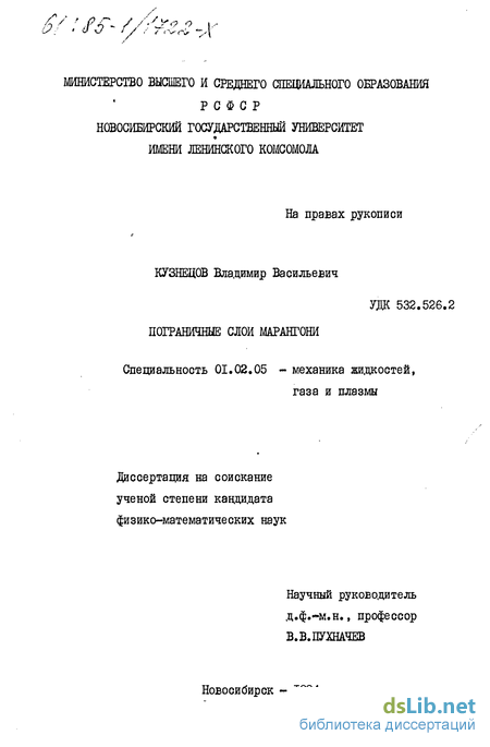 Диссертация состоит из введения, четырех глав и заключения. В конце приводится список литературы разбита на восемь пунктов. В первом пункте формулируется изучаемая в дальнейшем задача для стационарной осе-симметричной термокапиллярной конвекции. Во втором пункте определяются характерные параметры задачи, и на основе сделанных предположений предлагается следующая схема решения задачи: выделяются пограничные слои возле свободной боковой поверхности и твердых основаниях жидаого цилиндра; все три пограничных слоя сопрягаются с неким основным ядром течения. Относительно ядра течения предполагается, что линии тока в нем замкнуты. В третьем пункте задача для ядра течения решается на основе схемы Праццтля-Бэтчелора 24 J ; решение дается в виде ряда Фурье и зависит от некоторой адитивной постоянной С . В пунктах 4-6 выводятся системы уравнений и краевые условия для всех трех пограничных слоев и отмечаются особенности возникающих задач. В пункте 7 выводится уравнение .для определения постоянной С , которое представляет собой преобразованное энергетическое тождество .для жидаого объема. Восьмой пункт посвящен построению аналогичной схемы решения для плоского случая. Глава 2 посвящена исследованию полученных в главе I краевых задач .для пограничных слоев и состоит из трех пунктов. В первом пункте получена теорема существования и единственности решения задачи продолжения пограничного слоя Марангони на интервал любой прошаженности. Основным условием существования является неположительность градиента температуры вдоль свободной границы. Во втором пункте исследованы некоторые свойства решений задачи .для пограничного слоя Марангони; в частности, получены асимптотические оценки решения при удалении от свободной поверхности. В третьем пункте исследовалась задача продолжения пограничного слоя вблизи твердой стенки при возрастании давления вниз по потоку. Получены достаточные условия существования и единственности решения задачи продолжения в случаях, когда градиент давления Р положителен, но удовлетворяет одному из неравенств: Последний результат обобщает работу 21 , где рассмотрен случай р X . В главе 3 приведена групповая классификация задач для «двумерного стационарного пограничного слоя Марангони, указаны все возможные в этом случае виды инвариантных решений и приведены некоторые примеры инвариантных решений, интересных тем, что такие решения не имеют физического смысла для пограничного слоя вблизи твердой стенки, но ЕПОЛНЄ возможны для пограничного слоя Марангони. В главе 4 по предложенной в главе I асимптотической схеме проводился численный расчет поля скоростей термокапиллярной конвекции расплава при выращивании монокристаллов методом направленной кристаллизации в случае отсутствия силы тяжести. При этом значения материальных констант расплава брались соответствующими расплавленному германию. Вблизи фронта кристаллизации выделялся концентрационный пограничный слой [23], и проводился численный расчет полученной задачи.