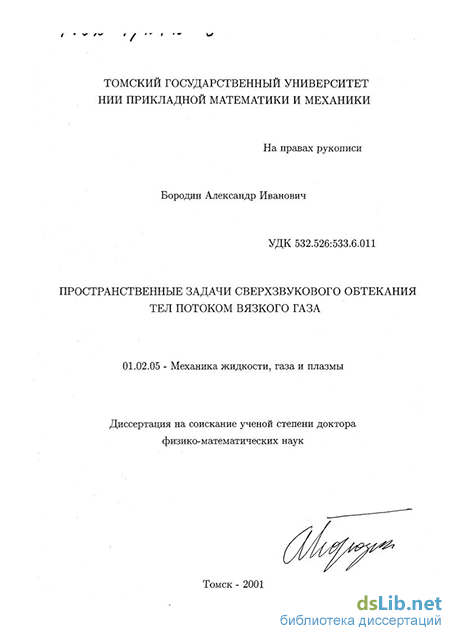 Бородин Александр Иванович. Пространственные задачи сверхзвукового обтекания тел потоком вязкого газа : диссертация ... доктора физико-математических наук : 01.02.05.- Томск, 2001.- 250 с.: ил. РГБ ОД, 71 02-1/272-5