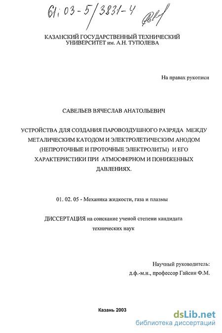 Одним из новых способов получения низкотемпературной неравновес- ной плазмы является использование разряда, горящего между твердым и жидким неметаллическими электродами, а также между жидкими неметаллическими электродами [1]. Такие разряды используются в плазменной технологии для нанесения высококачественных защитных покрытий [2], а также для нагрева металлов и сплавов в электролите [3], получения металлических порошков и т.д. Несмотря на большие возможности использования данных разрядов в народном хозяйстве, имеющиеся в литературе экспериментальные и теоретические данные не позволяют достаточно уверенно судить о закономерностях и механизмах разрядов между электролитическим анодом и металлическим катодом. Нет единого мнения о природе разрядов с электролитическим анодом, и не изучена физика приэлектродных процессов. Остается малоизученным взаимодействие плазмы паровоздушного разряда между электролитическим анодом (непроточные и проточные электролиты) и металлическим катодом с поверхностями твердых тел. Все это препятствует широкому применению неравновесной плазмы разряда с электролитическим анодом в промышленности. В связи с вышеизложенным, экспериментальное и теоретическое исследования разряда в газе между электролитическим анодом (непроточные и проточные электролиты) и металлическим катодом; разработка плазменных установок с жидкими электродами представляют собой актуальную задачу. Данная диссертация, состоящая из четырех глав, посвящена решению этих задач.
