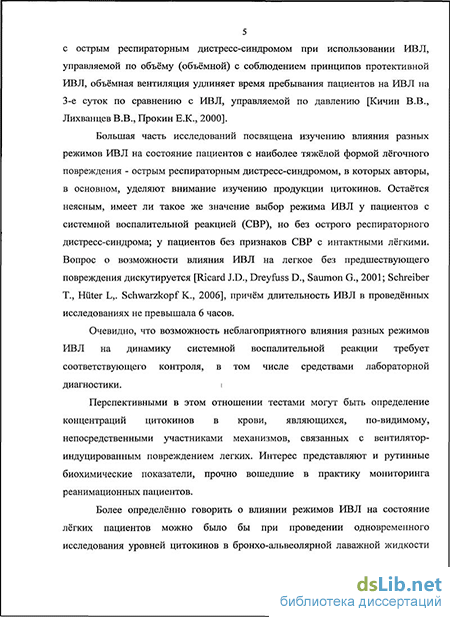 Большая часть исследований посвящена изучению влияния разных режимов ИВЛ на состояние пациентов с наиболее тяжёлой формой лёгочного повреждения - острым респираторным дистресс-синдромом, в которых авторы, в основном, уделяют внимание изучению продукции цитокинов. Остаётся неясным, имеет ли такое же значение выбор режима ИВЛ у пациентов с системной воспалительной реакцией (СВР), но без острого респираторного дистресс-синдрома; у пациентов без признаков СВР с интактными лёгкими. Вопрос о возможности влияния ИВЛ на легкое без предшествующего повреждения дискутируется [Ricard J.D., Dreyfuss D., Saumon G., 2001; Schreiber T., Hter L,. Schwarzkopf K., 2006], причём длительность ИВЛ в проведённых исследованиях не превышала 6 часов.