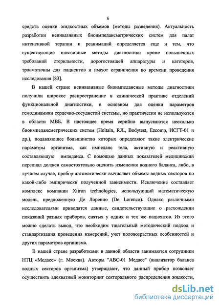 В нашей стране неинвазивные биоимпедансные методы диагностики получили широкое распространение в клинической практике отделений функциональной диагностики, в основном для оценки параметров гемодинамики сердечно-сосудистой системы, но практически не используются в области МВБ. В настоящее время серийно выпускаются несколько биоимпедансметрических систем (Holtain, RJL, Bodytest, Ezcomp, ИСГТ-01 и др.), подавляющее большинство которых определяют такие электрические параметры организма, как импеданс тела, активную и реактивную составляющую импеданса. С помощью данных показателей медицинский персонал должен самостоятельно оценить изменения водного баланса, либо, в лучшем случае, прибор автоматически вычисляет объемы водных секторов по какой-либо эмпирически полученной зависимости. Исключение составляет комплекс компании Xitron technologies, использующий математическую модель, предложенную Де Лоренцо (De Lorenzo). Однако различными исследователями приводятся данные, свидетельствующие о расхождении показаний разных приборов, снятых у одних и тех же пациентов. Из этого можно сделать вывод, что необходим тщательный методический подход и стандартизация проведения измерений, учет половозрастных особенностей и других параметров организма.