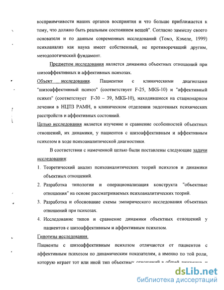 Предметом исследования является динамика объектных отношений при шизоаффективных и аффективных психозах.