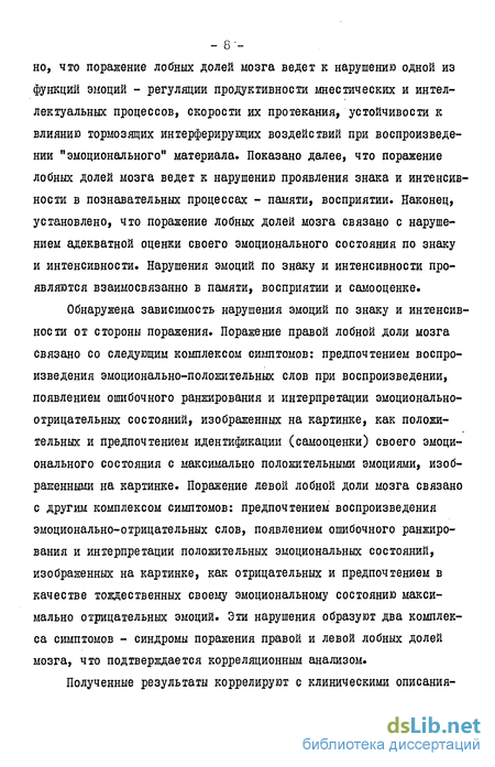 Было, наконец, показано, что у контрольных групп больных с внелобным очагом поражения результаты близки к нормальным, но имеющим свою специфику, которая заключалась в том, что на познавательные процессы, через которые изучались эмоции, оказывали влияние собственно мнестические нарушения и нарушения динамики протекания познавательных процессов. Специфика больных заключалась и в особом эмоциональном состоянии больных, связанным с ситуацией болезни, в которой они находились.