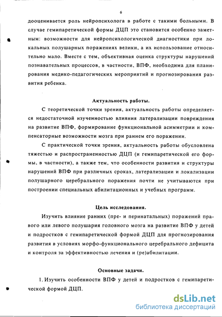 С практической точки зрения, актуальность работы обусловлена тяжестью и распространенностью ДЦП (и гемипаретической его формы, в частности), а также тем, что особенности развития и структуры нарушений ВПФ при различных сроках, латерализации и локализации полушарного церебрального поражения почти не учитываются при построении специальных абилитационных и учебных программ.