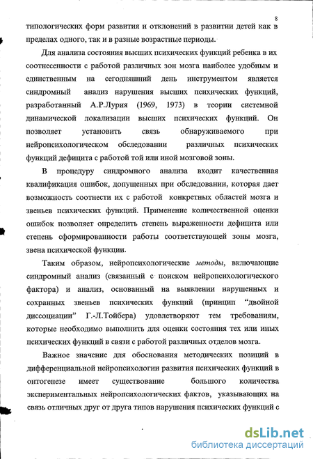Для анализа состояния высших психических функций ребенка в их соотнесенности с работой различных зон мозга наиболее удобным и единственным на сегодняшний день инструментом является синдромный анализ нарушения высших психических функций, разработанный А.Р.Лурия (1969, 1973) в теории системной динамической локализации высших психических функций. Он позволяет установить связь обнаруживаемого при
