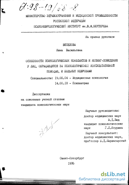 Актуальность темы. На современном сложном этапе становления отечественной психологической консультативной службы большое значение приобретает разработка новых методологических подходов и методических приемов для их практического внедрения (Карвасарский Б.Д., 1982; Мягер В.К. 1983; Столин 8.В., 1983; Спиваковская А.С, 1980,1988; Исурина Г.Л., 1983; Ташлыков В.А., 1984; Александров А.А., 1993, и др.). Психопрофилактическое направление медицины, предболезненные состояния становятся объектом внимания как отечественных, так и зарубежных специалистов (Кабанов М.М., 1972; Серебрякова P.O., 1974; Корольков А.А., Пет-ленко В.П., 1977; Семичов СВ., 1982; Александровский Ю.А., Соб-чикЛ.Н., 1986; hihefl М.Д979).