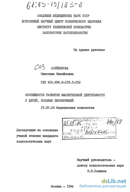 - Особенности формирования мыслительных операций у детей, больных вялотекущей шизофренией с неблагоприятным течением процесса