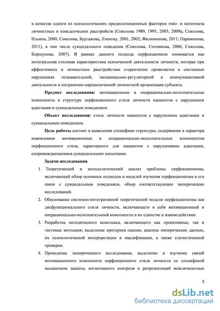 Данное исследование является продолжением многолетнего системного исследования структуры и функционирования аффективно-когнитивного стиля личности в качестве одного из психологических предиспозиционных факторов этио- и патогенеза личностных и поведенческих расстройств (Соколова Е.Т., 1989; 1995; 2003; 2009а; Соколова Е.Т., Ильина СВ., 2000; Соколова Е.Т., Бурлакова Н.С., ЛэонтиуФ., 2001; 2002; Филимонова А. С, 2011; Парамонова В.В., 2011), в том числе суицидального поведения (Соколова Е.Т., Сотникова Ю.А., 2006; Соколова Е.Т., Коршунова А.Р., 2007).